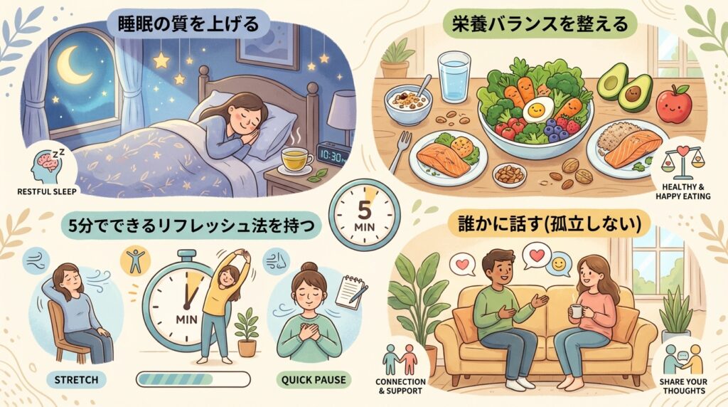 イライラしたら「深呼吸をする」「ベランダに出て外の空気を吸う」「好きなコーヒーを飲む」など、自分なりのリセットボタンを持ちましょう。