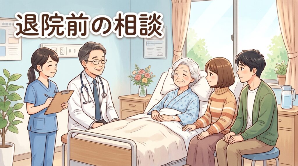 退院前カンファレンス(病院での退院前会議)には必ず出席してください。ここで訪問PTの配置、介護サービスの内容、医療的ケアの引き継ぎが確認できます。