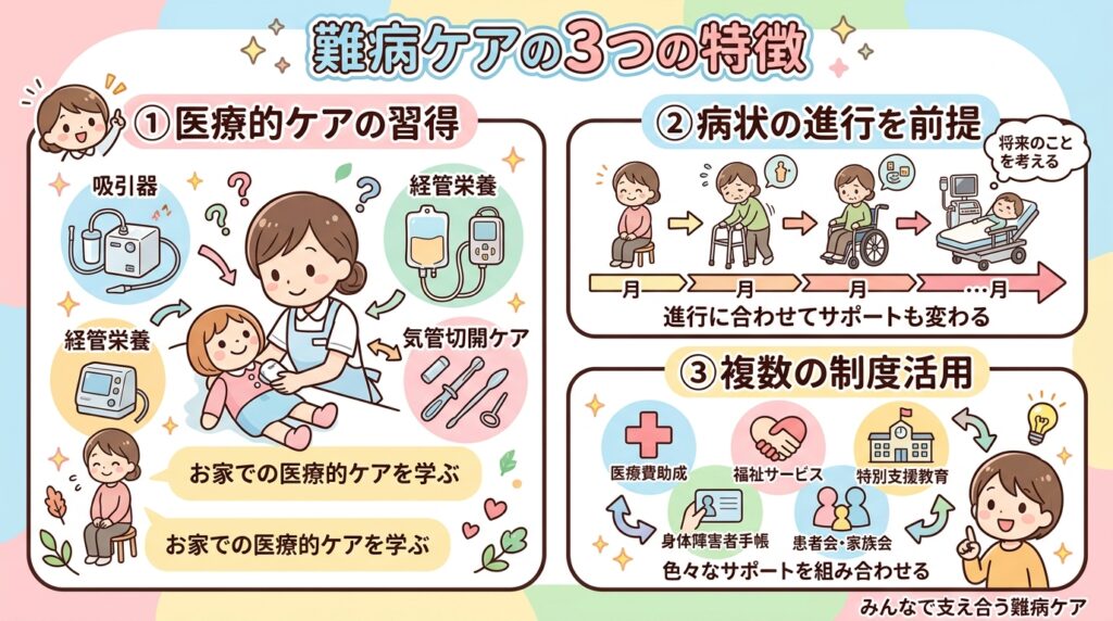 難病の場合、難病医療費助成制度(指定難病)、重度訪問介護(障害者総合支援法)、難病相談支援センターの無料相談など、一般の高齢者介護では利用できない制度が複数存在します。これらを退院前に組み合わせておく必要があります。
