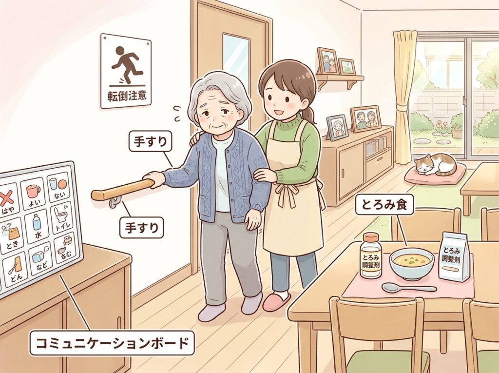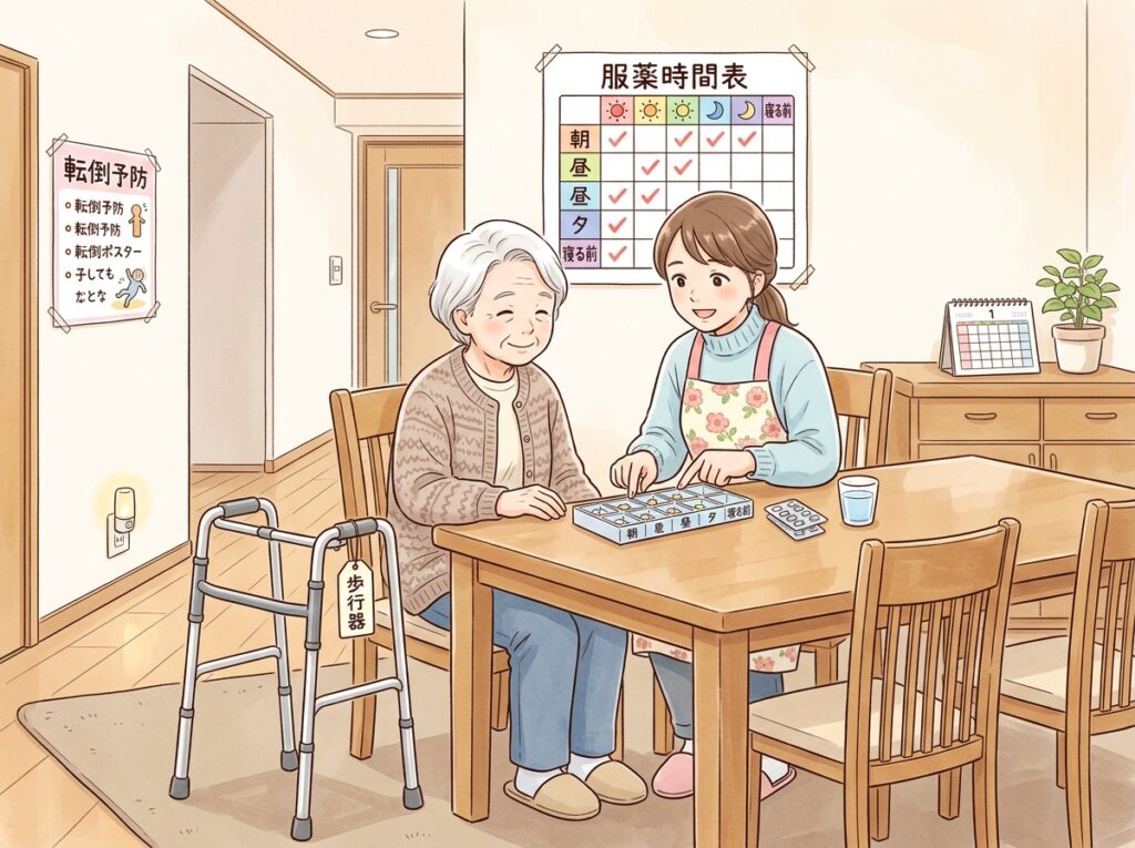 - 夜間の転倒・夜間頻尿への対応(ベッドサイドの手すり・夜間照明)